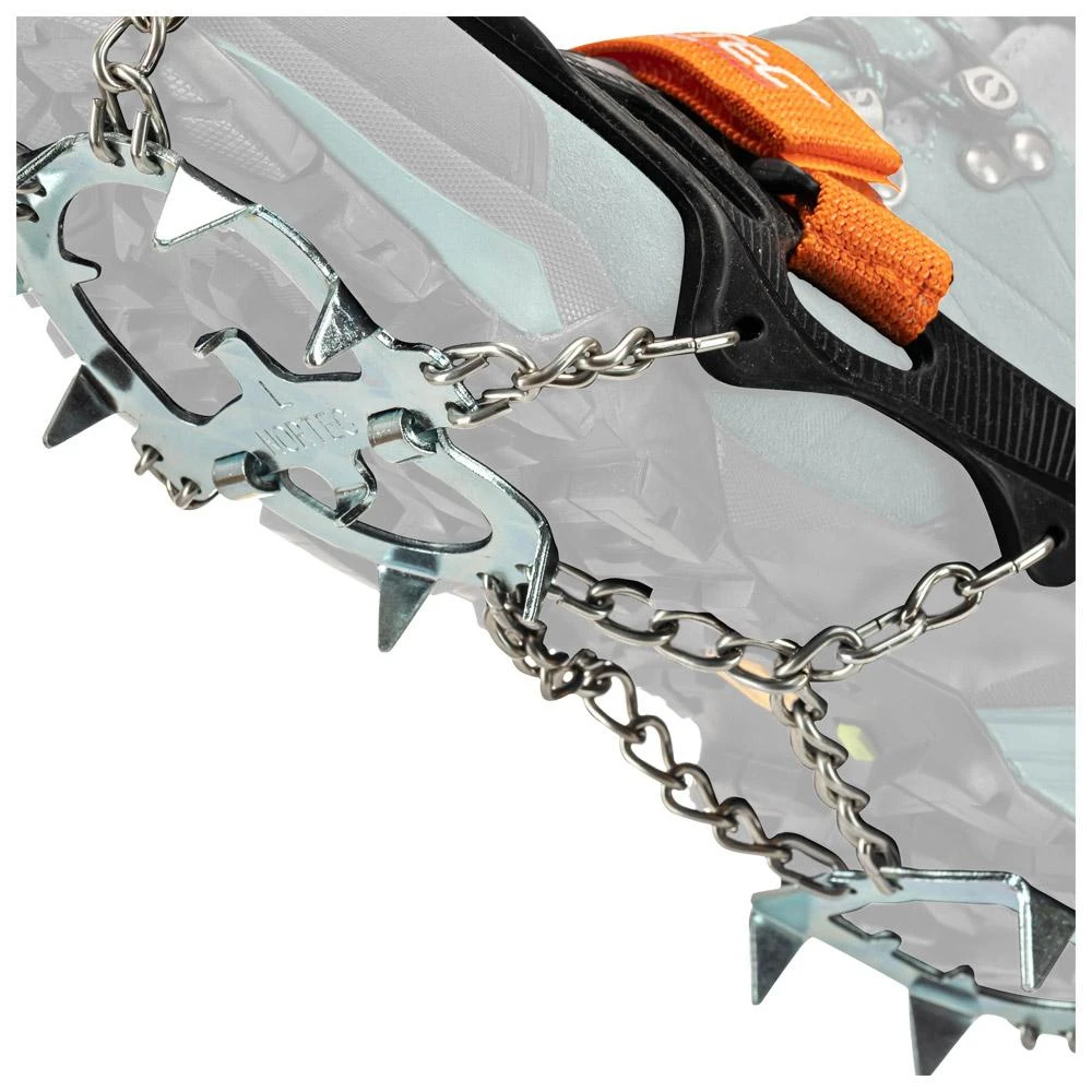 Ces semelles antidérapantes améliorent votre adhérence lorsque vous évoluez sur différentes surfaces glissantes, glace, neige dure, sol gelé grâce aux 13 pointes de 7 et 17 mm de long. L’élastomère utilisé pour le maintien des micro-crampons sur la chaussure assure stabilité et installation rapide. Ce matériau a été testé à des températures atteignant les -60°C. Une bande Velcro élastique assure le bon ajustement et vous garantit un maximum de confiance sur tous les terrains. Les chaines qui font le lien entre la partie semelle et la partie fixation sont fabriquées en acier haute-qualité afin d’offrir résistance et fiabilité. Le crampon avant est doté d’une charnière afin d’éviter l’accumulation de neige ou de glace. Un sac de transport et de rangement robuste protège votre sac à dos.